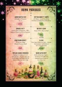 Pro Tip: Don’t forget to pre-order your Drink Packages! From the “Wicked Witch Fizz” (Prosecco) to “Defying Gravity Shots,” we have pre-set bundles to make your arrival seamless.