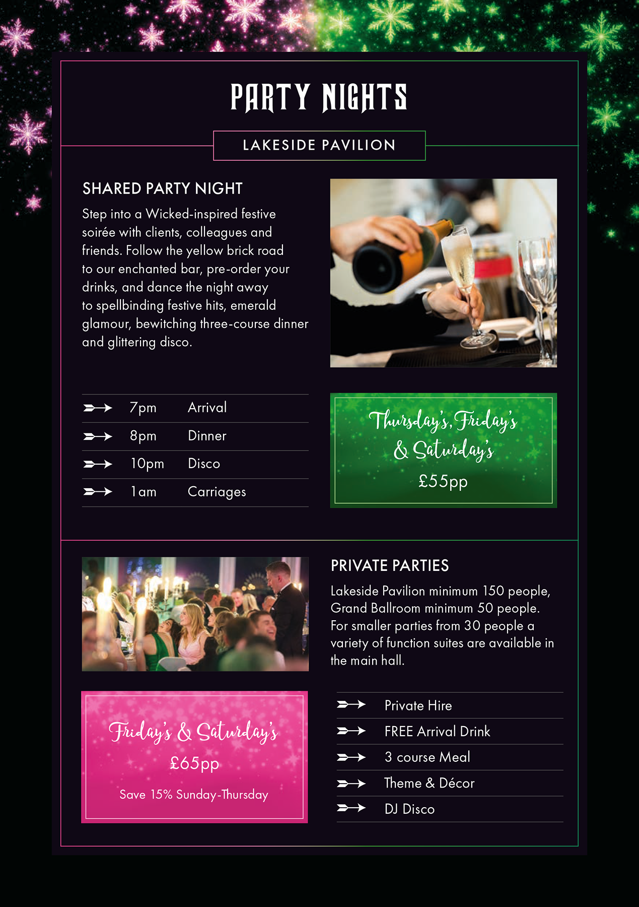 - The Itinerary: 7pm Arrival | 8pm Dinner | 10pm Disco | 1am Carriages.