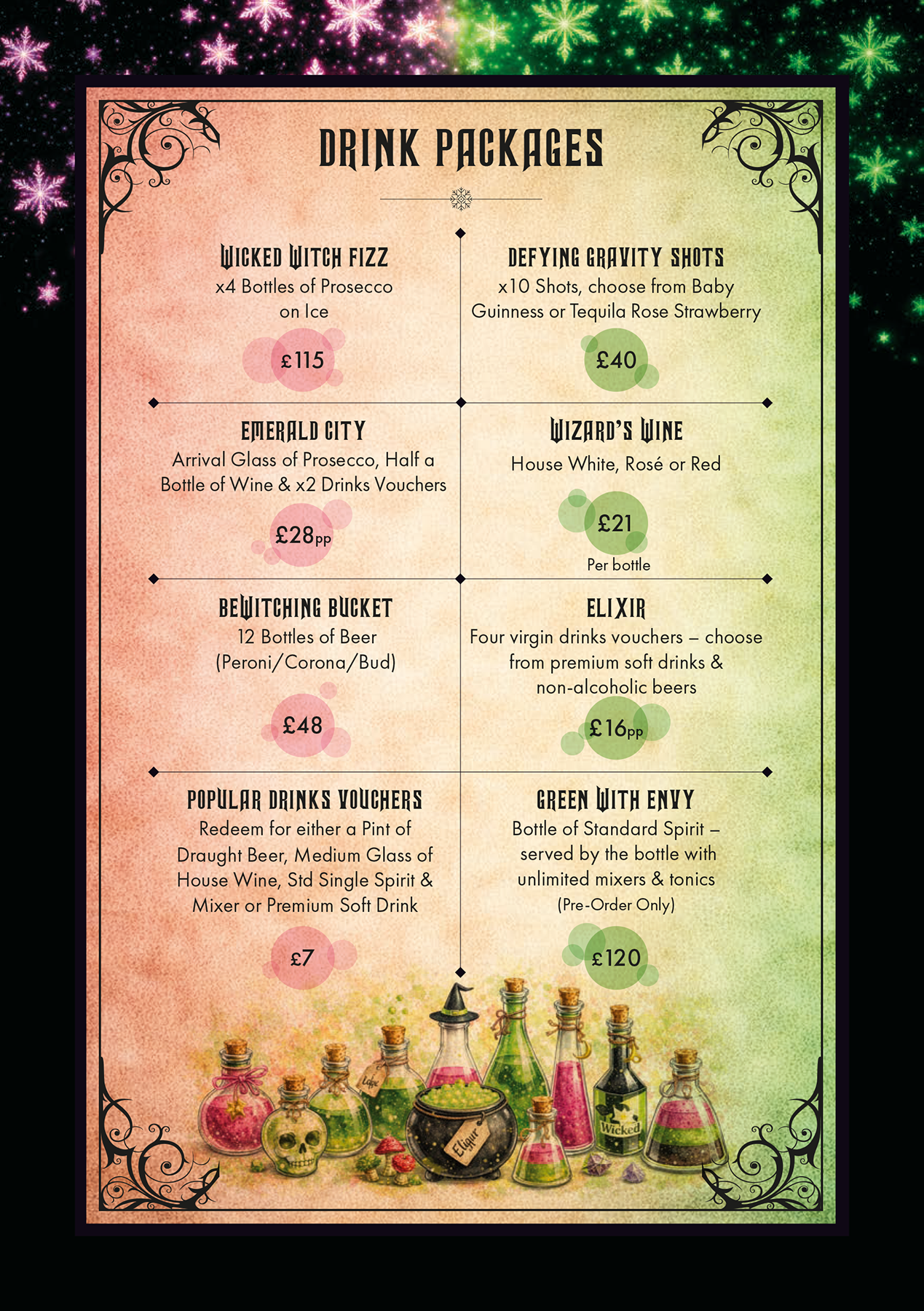 Pro Tip: Don’t forget to pre-order your Drink Packages! From the “Wicked Witch Fizz” (Prosecco) to “Defying Gravity Shots,” we have pre-set bundles to make your arrival seamless.